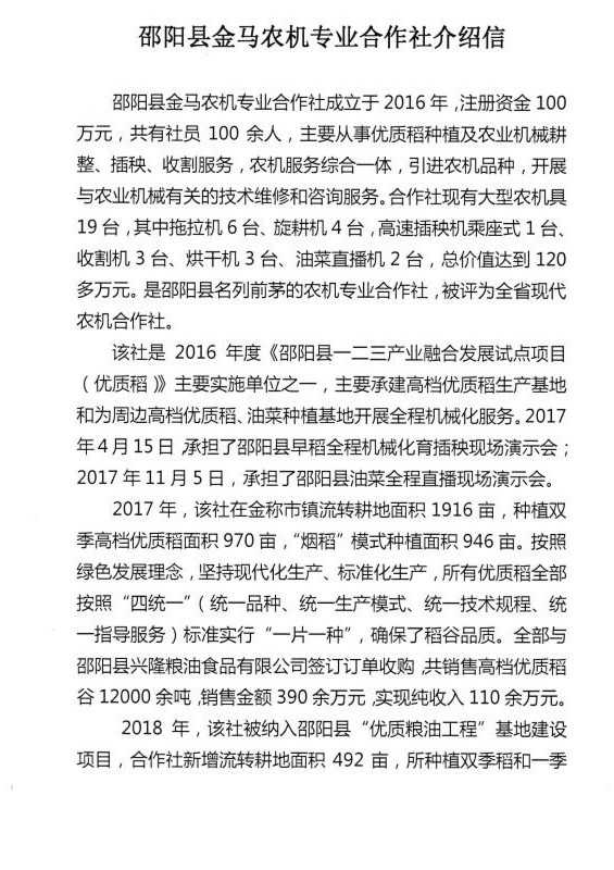 在農(nóng)機(jī)專(zhuān)業(yè)合作社的幫助下,當(dāng)?shù)剞r(nóng)業(yè)生產(chǎn)過(guò)程的機(jī)械化程度非常高。邵陽(yáng)縣金馬農(nóng)機(jī)專(zhuān)業(yè)合作社,位于邵陽(yáng)縣金稱市鎮(zhèn)石馬村,主要提供組織農(nóng)業(yè)機(jī)械耕整、插秧、收割服務(wù),大大提高了當(dāng)?shù)氐姆N植和生產(chǎn)效率。