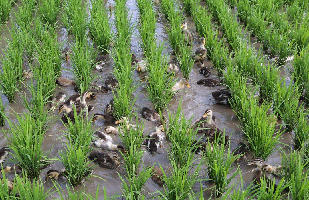 除了科技富硒外,過灣富硒米還采用了稻鴨共作的種植技術(shù)。鴨子以天然水草和水生物為食,免去除草劑的使用,直接代替人工解決了除草和除蟲。同時,鴨子在稻田間游動不僅加強水稻根部的空氣流動,促進水稻的呼吸作用,同時也可以耙田濁水,促動水田流動,疏松土壤,刺激水稻生長。鴨糞落入稻田也是天然有機肥,給水稻補充天然養(yǎng)料。因此這種稻鴨共作的方式不僅利于環(huán)境的保護,也可以在適當(dāng)提高水稻產(chǎn)量,利于鴨子的生長,形成有益的生態(tài)循環(huán)。