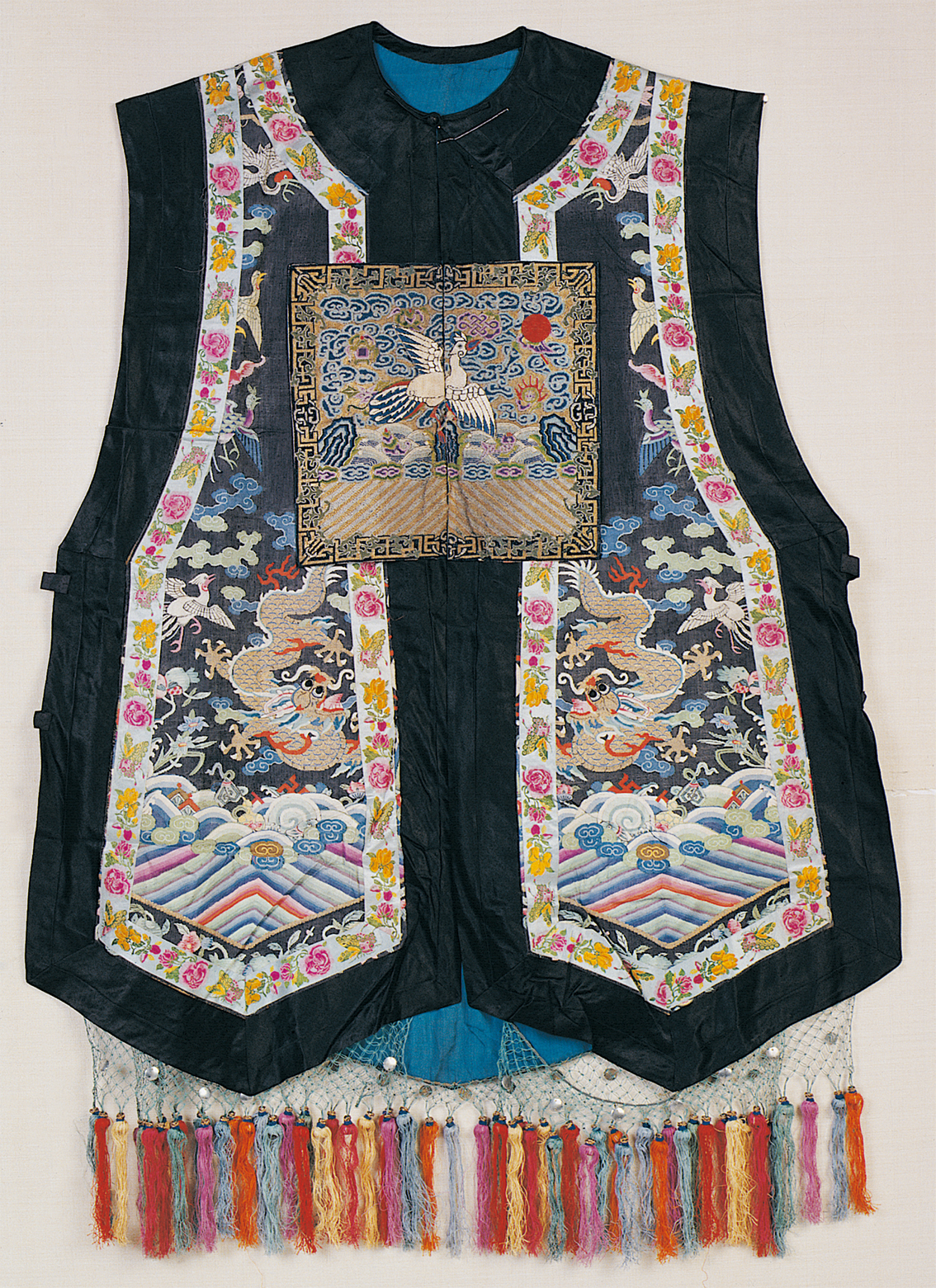 《史記·五帝本紀》載:“黃帝之前,未有衣裳屋宇。及黃帝造屋宇,制衣服,營殯葬,萬民故免存亡之難?!痹谖迩Ф嗄昵暗男率鲿r代仰韶文化時期,可能就產(chǎn)生了原始的農(nóng)業(yè)和紡織業(yè),開始用織成的麻布來做衣服。據(jù)傳,黃帝之妻嫘祖發(fā)明了飼蠶和絲紡,衣冠服飾基本成制。殷商西周,冠服制度逐漸完善,春秋戰(zhàn)國時期,衣冠款式走向多元,冠服制被納入“禮治”范疇,從此漢族衣冠服制更加詳備。中原地區(qū)還出現(xiàn)了胡服戎裝,甚至相沿成風(fēng)(圖為漢族清代七品文官女朝褂,中央民族大學(xué)民族博物館館藏)。