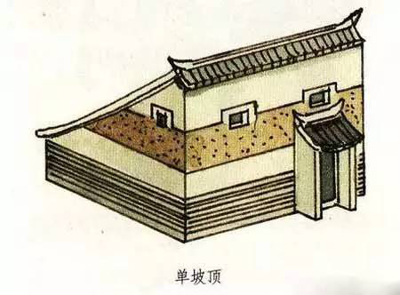 單坡頂就是只有一面坡的屋頂。它與我們常見的兩面坡屋頂有較大的不同,但從一面來看又有極大的相似性。我們甚至可以說,單坡屋頂就像是兩面坡屋頂被從中間一切兩半了。單片屋頂一般都用在不太重要的建筑或是附屬性的建筑上。在已發(fā)掘的商代宮殿遺址中,可以看到在商代即有單坡頂?shù)睦茸恿?。而現(xiàn)在的陜西、陜西等地的農村,許多民居仍然使用單坡式的屋頂,成為現(xiàn)今較富有特色的一種民居形式。