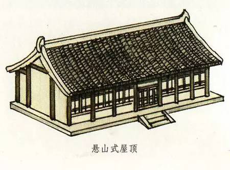 懸山式屋頂與硬山式屋頂一樣有一條正脊和四條垂脊。不過,它又有不同于硬山式屋頂那樣與山墻平齊,而是伸出山墻之外。這部分伸出山墻之外的屋頂是由下面伸出的桁(檁)承托的。所以懸山式屋頂不僅有前后出檐,在兩側山墻上也有出檐。懸山式是兩面坡屋頂?shù)脑缙谧龇ǎ贿^中國古代的重要建筑基本沒有使用懸山式屋頂?shù)?,特別是唐代以前尤為少見。
