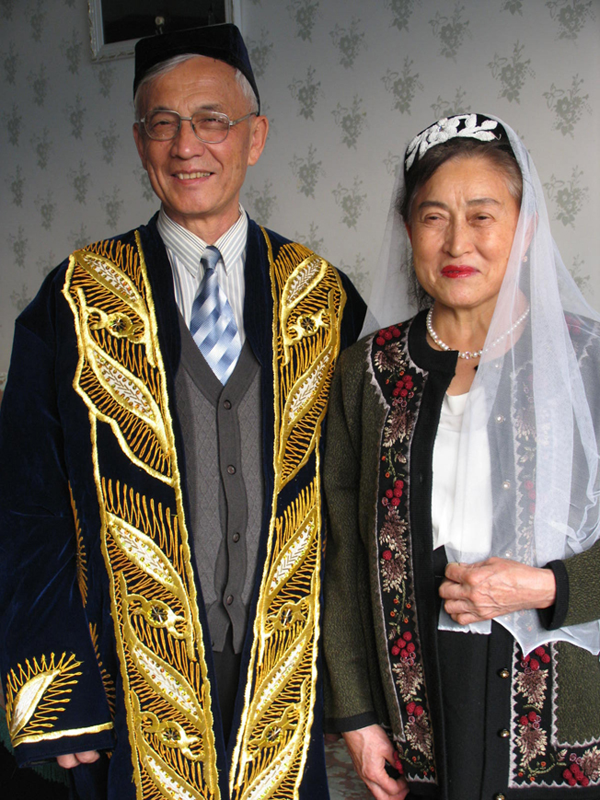 烏孜別克族男子的傳統(tǒng)服裝是一種長度過膝的長衣,長衣有兩種款式,一種為直領、開襟、無衽,在門襟、領邊、袖口上繡花邊。信服上有花色圖案,十分美觀;另一種為斜領、右衽的長衣,類似維吾爾族的“袷袢”。腰束三角形的繡花腰帶,一般年輕人的腰帶色彩都很艷麗,所穿領邊、袖口、前襟開口處都繡著紅、綠、藍相間的彩色花邊圖案,表現(xiàn)了烏孜別克族工藝美術的特點。老年人卻愛穿黑色長衣,腰帶的顏色也偏于淡雅。烏孜別克男女傳統(tǒng)上都愛穿皮靴、皮鞋,長靴外面還常穿膠制淺口套鞋,進屋時脫下套鞋,就可以不把泥土帶進屋內,十分衛(wèi)生。