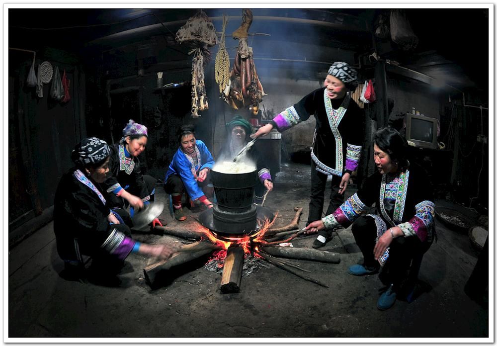 人略施小計,使牛變成草食的家伙,省了口糧。人覺得這樣做對不起牛,所以仍讓牛住樓下老地方,一直住到現(xiàn)在;而且每年四月初八都蒸黑糯飯,殺雞宰鴨過黑飯節(jié),趁機給牛優(yōu)待,開膳時抓一糰黑糯米飯供牛受用,有福同享,略帶“努都弱沙”澀味的染色飯食,不但別有一番風味,還有祛濕消滯清熱的效能哩,營養(yǎng)藥效兼而有之,對人對牛的健康都有好處;還特別給牛預備一捆綠油油的嫩草,有的人家還將一把嫩草吊掛于牛欄門口供牛作節(jié)食。這事著實令人感動,肚有墨水的人給它起了個雅致的名號叫牛魂節(jié),意為牛是有靈魂的,它有恩于人,應該三牲享祭,給牛安魂,替牛定魄,并在牛欄兩邊門縫和門口地面焚插鳧鳧香炷,牛欄門頭貼一片到幾、三五片巴掌般寬、七八寸的長方形的紅紙,這玩藝不規(guī)則地染印顆顆金星,下垂一端呈鋸齒狀,微風吹來“皮皮婆婆”地拂動,像一團熱烈跳動的火焰,祈求上蒼保佑牛像這紅紅的火焰一樣,祈求上蒼保佑牛健壯興旺。